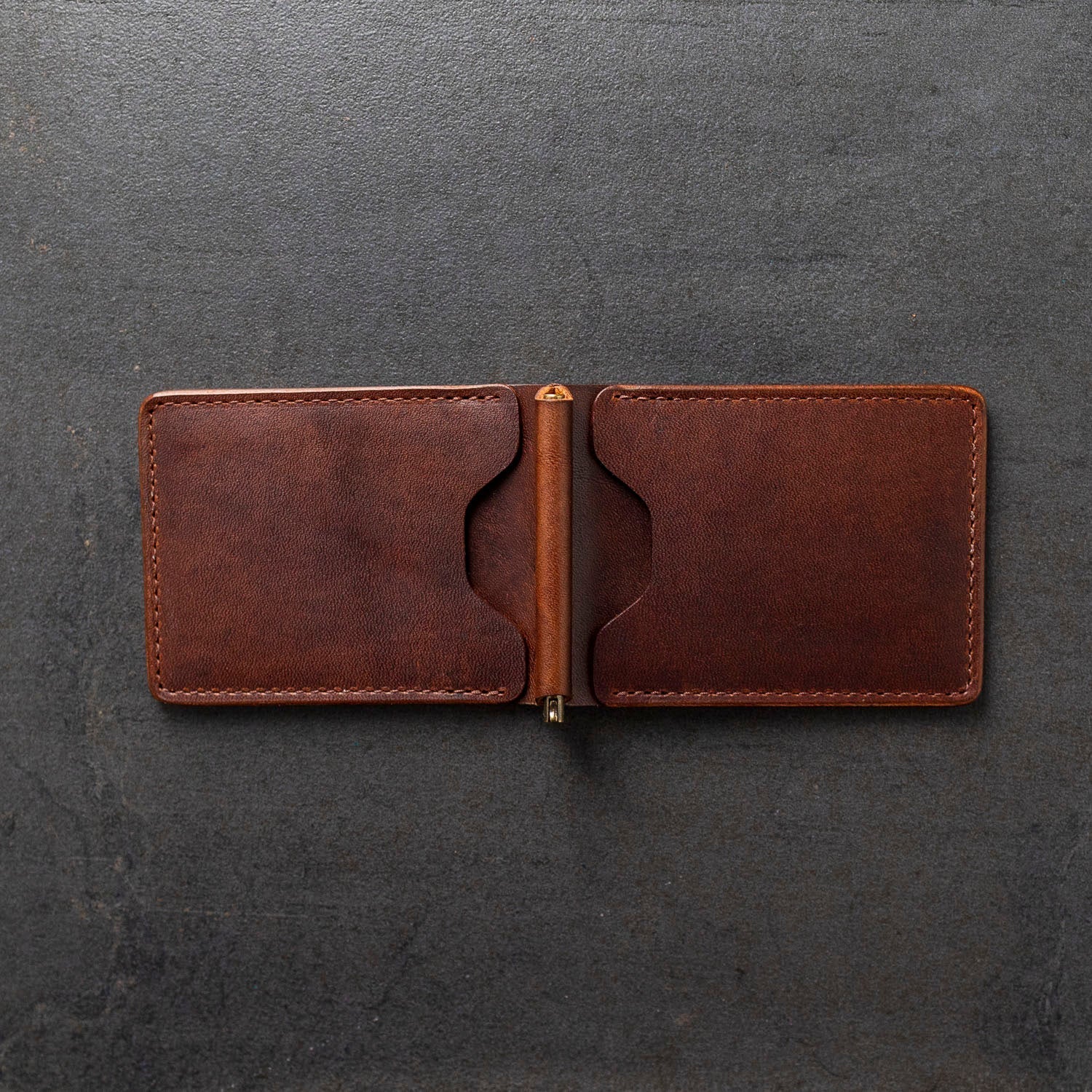 The Capone leather money clip is a thin, minimalist wallet designed for easy access to cards and cash. Handcrafted in Chicago from famous Horween leather. Cypress leather is a full grain, drum-dyed, vegetable retanned leather finished with a tough wax coat. It has intense grain character, a rich waxy feel, and is built for patina.