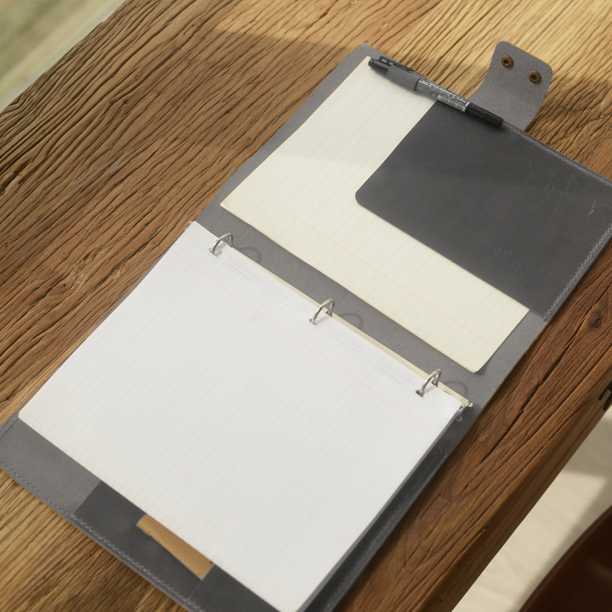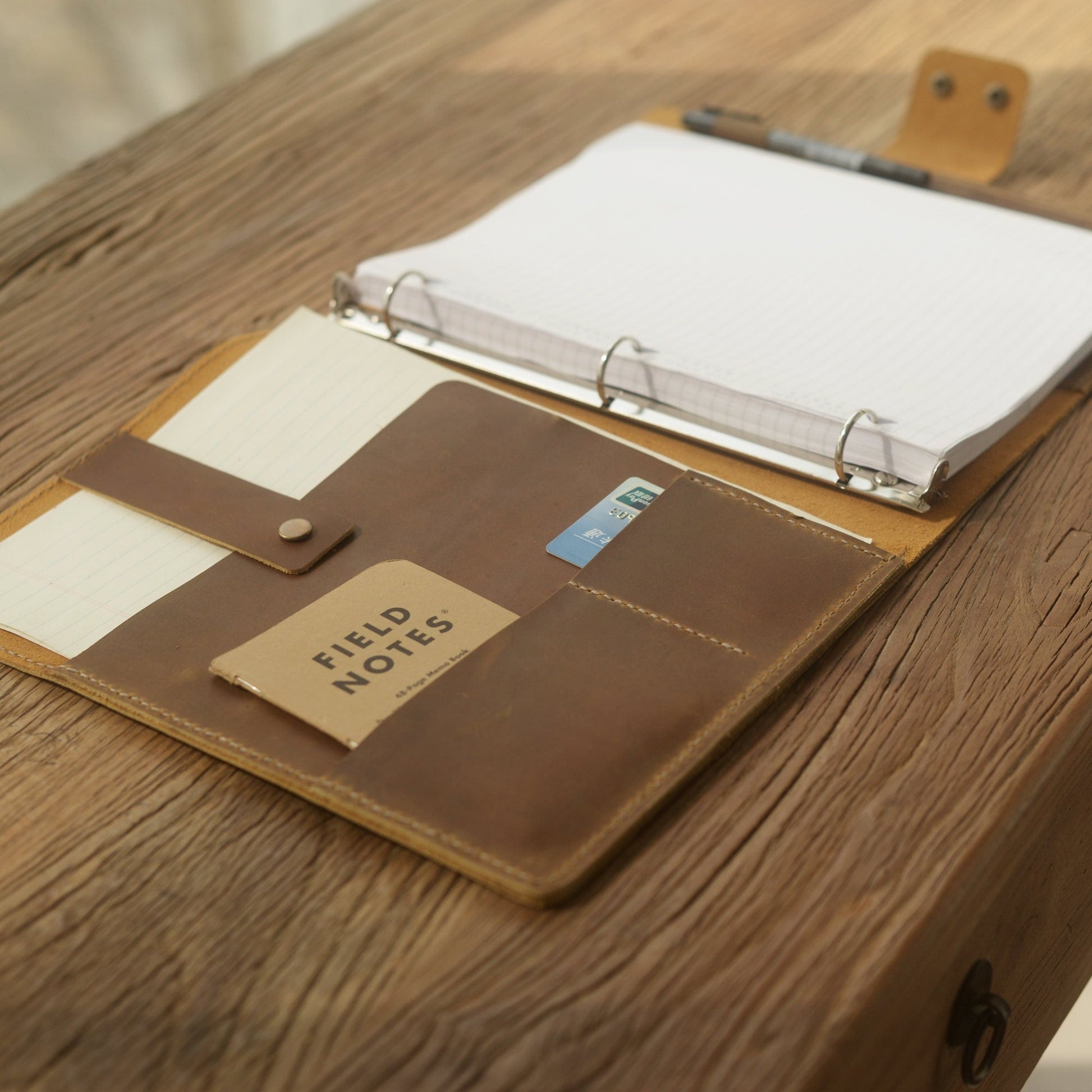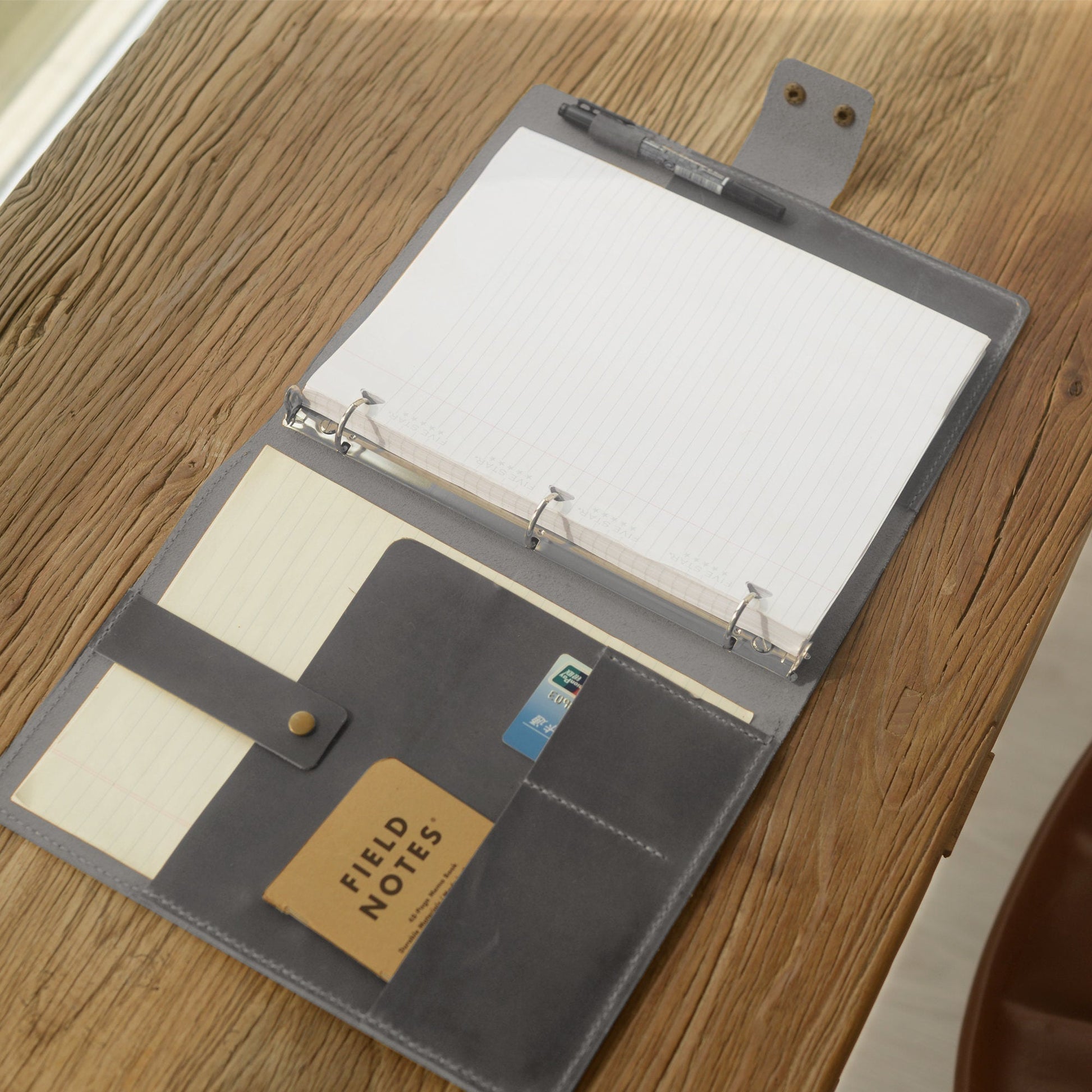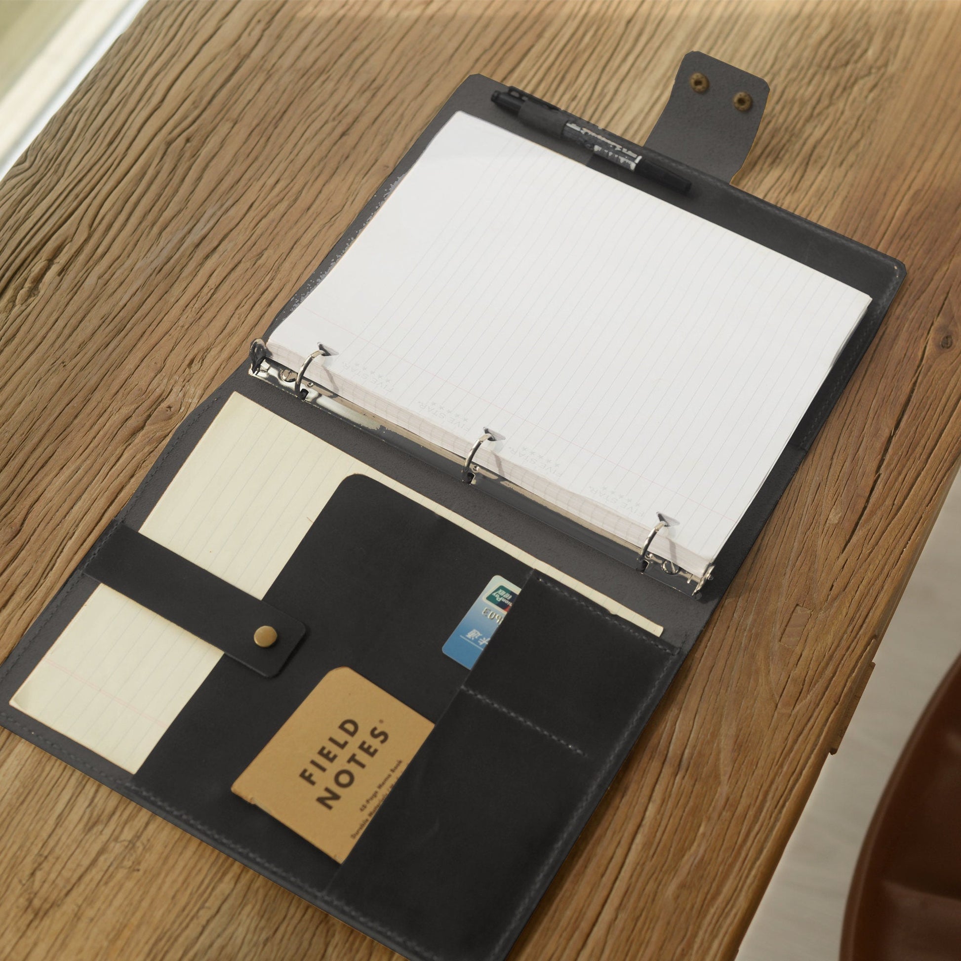 This leather 3 ring binder portfolio is made from full grain leather and includes a metal 3 ring mechanism to fit for 8.5 x 11 inch letter size or A5 papers, reports or use a tab divider for documents and photos. With additional pockets for cards and notes in the left side, this leather binder offers plenty of space to take everything you need for a meeting or traveling, perfectly fit for your business trip and office use! It is also a perfect idea as a personalized gifts.