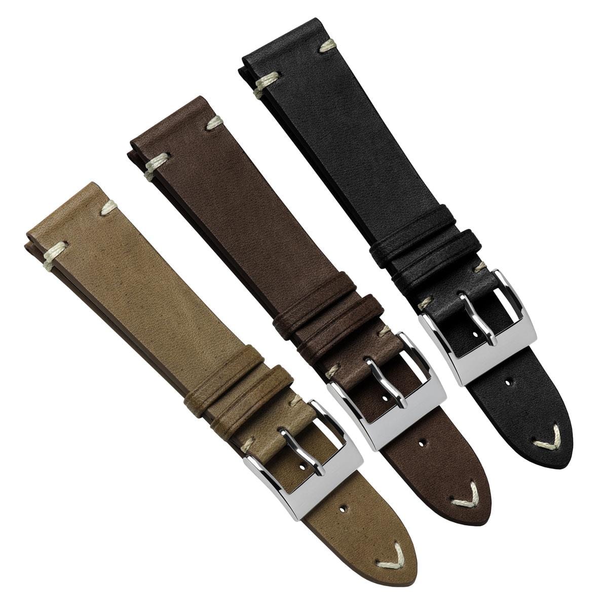 The handstitched edge of the Vintage Cavallo strap has been expertly executed using contrasting thread and hand-painted with a colour stain to match the leather. This watch strap is available in several lug widths, tapering by 2-4mm at the buckle depending on the size, and features a robust stainless-steel buckle with a highly polished finish.