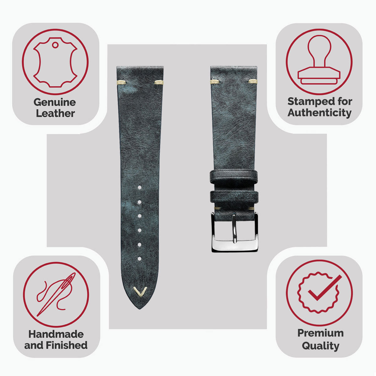 Vintage Stitching Patina Leather Watch Strap - Blue Jeans