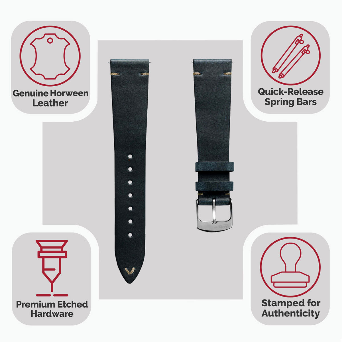 The Genuine Horween Chromoexcel® V-Stitch Leather Watch Strap is the perfect choice for those looking for a premium modern strap with authentic vintage charm. Presented with a classic flat design (tapering from 2.6mm to 3.2mm at the lug-end), the Genuine Horween Chromoexcel® V-Stitch Leather Watch Strap is finished with a superior stainless-steel buckle that has been meticulously polished for a sophisticated final look. Its flat construction also makes it the perfect accessory for your slim dress and vintage watches.